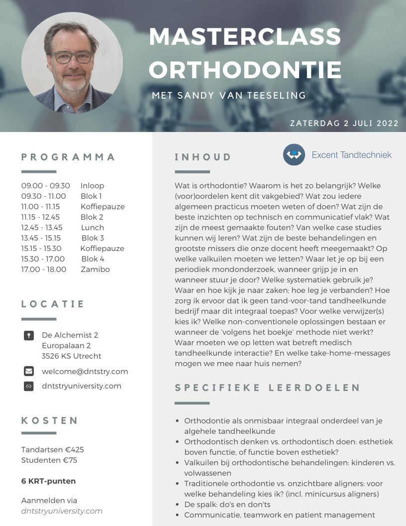DNTSTRY University presenteert in samenwerking met Sandy van Teeseling de Masterclass Orthodontie volgens het concept ‘Het beste van Sandy van Teeseling in één dag’. Alle highlights en laatste insights van dit vakgebied kant-en-klaar aangeleverd binnen een hoog interactieve setting van gelijkgestemde collega’s.