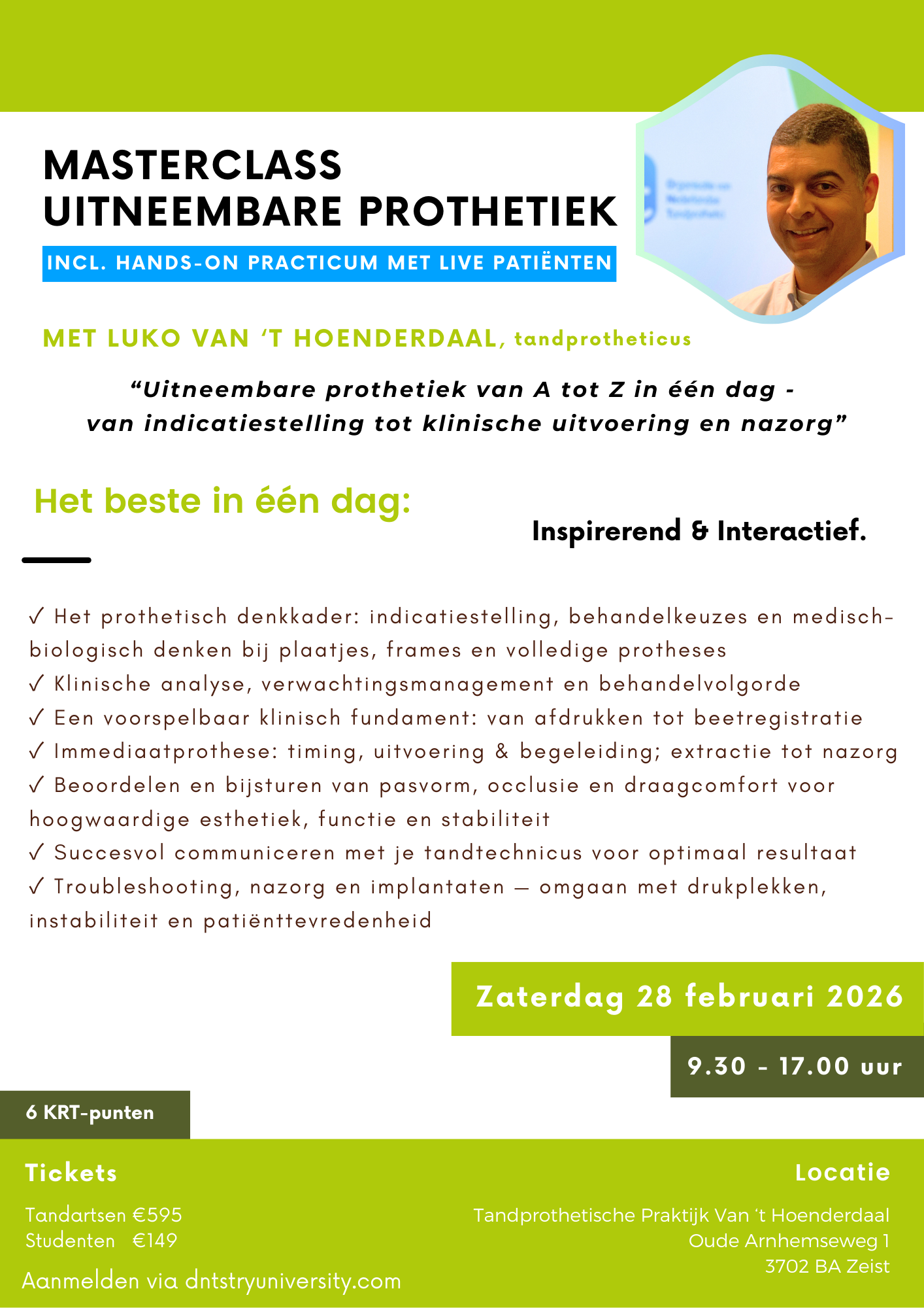 Op zaterdag 28 februari 2026 organiseert DNTSTRY University een intensieve en praktijkgerichte Masterclass Uitneembare Prothetiek. In één dag krijg je het volledige prothetische denkkader aangereikt — van indicatiestelling tot uitvoering en nazorg — inclusief een hands-on practicum met live patiënten.